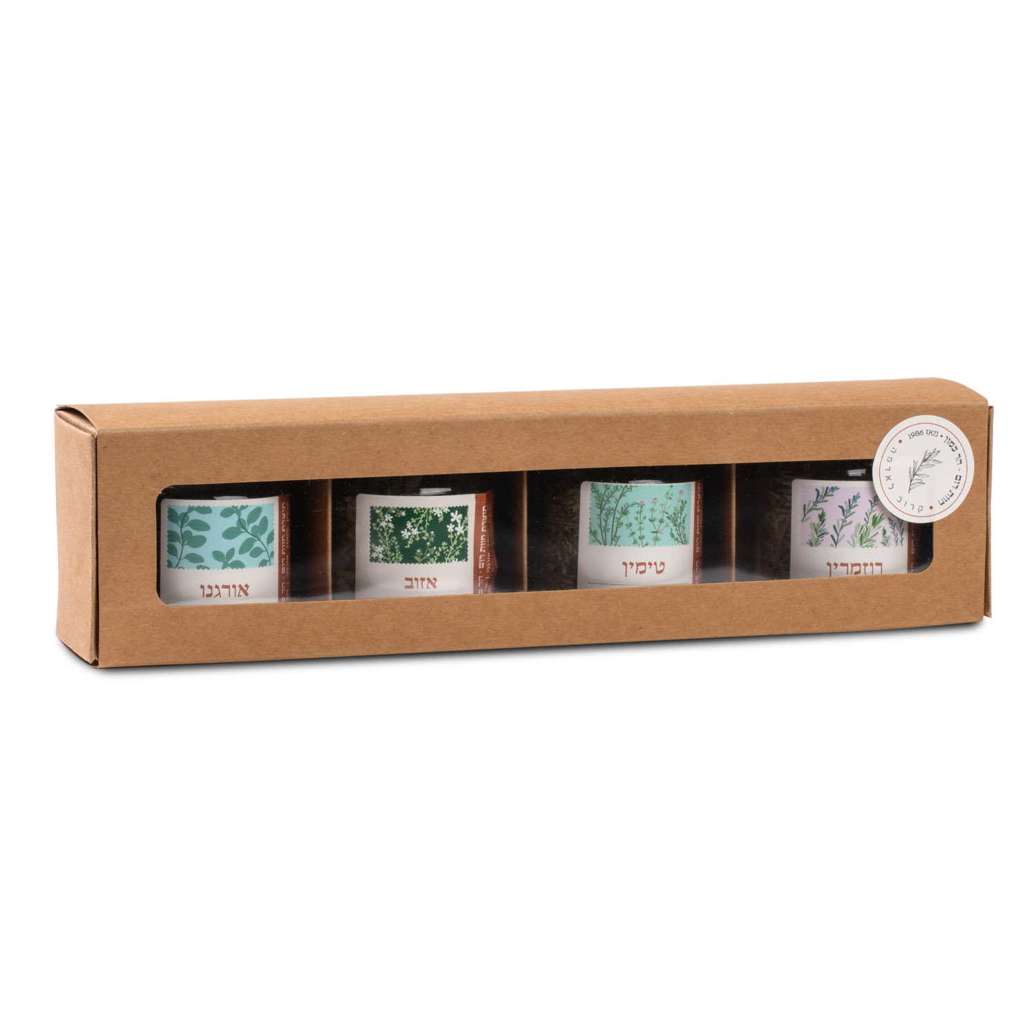 תכולת המארז: צנצנת תבלינים אורגניים מגידולי החווה: אורגנו, טימין, אזוב ורוזמרין. 60 מל' כל צנצנת